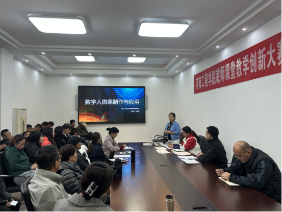 10月29日下午孙艳萍博士到体育教学部进行《数字人微课制作与应用》培训,全体教职工参会。党总支书记周凯主持会议。