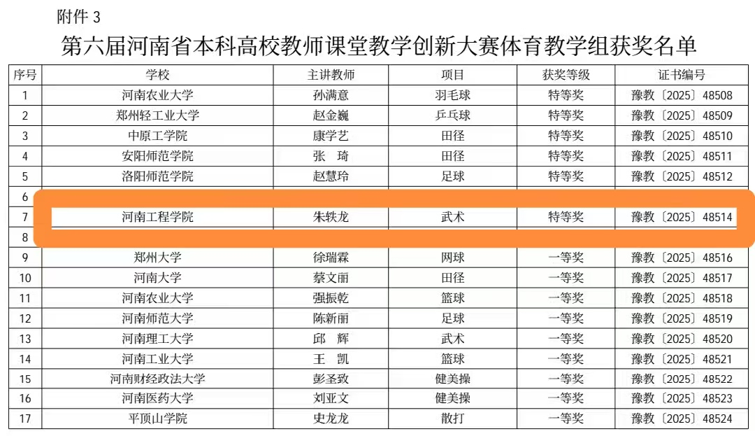 近日,由河南省教育厅主办、河南体育学院承办的第六届河南省本科高校教师课堂教学创新大赛体育教学组省级决赛在河南体育学院圆满落幕。我校体育教学部朱轶龙老师历经院赛、校赛的层层选拔,以省级复赛优异成绩晋级决赛,最终凭借体能测试双满分、专项技能精湛表现,成功斩获省级特等奖(全省仅10%获奖比例),充分彰显了我校体育教师的专业素养与教学创新能力。