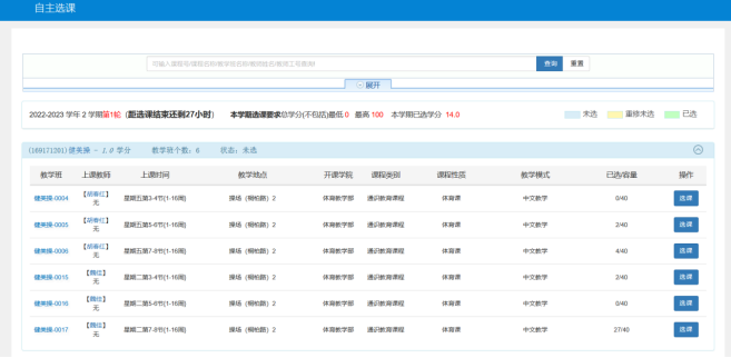 (6)补退选结束后,体育部教务办核查班级人数,班级人数少于15人,该课程取消,取消的课程班级不再进行通知。
